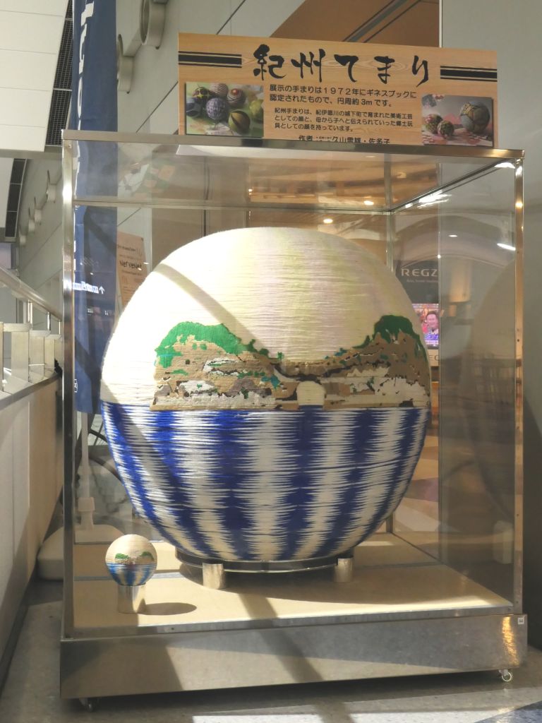 𝄆 紀州てまり 𝄇 紀州てまりは、和歌山の伝統工芸品として知られる糸毬で、江戸時代に紀州藩の殿中で姫のために作られるようになったのが始まりとされる。 No.1459 毬 【まり】 種類特産物 場所南紀白浜空港 地域和歌山県白浜町 国日本 訪問日令和7年12月20日 特大てまり 市町村名・場所名は、訪問時点のもの。